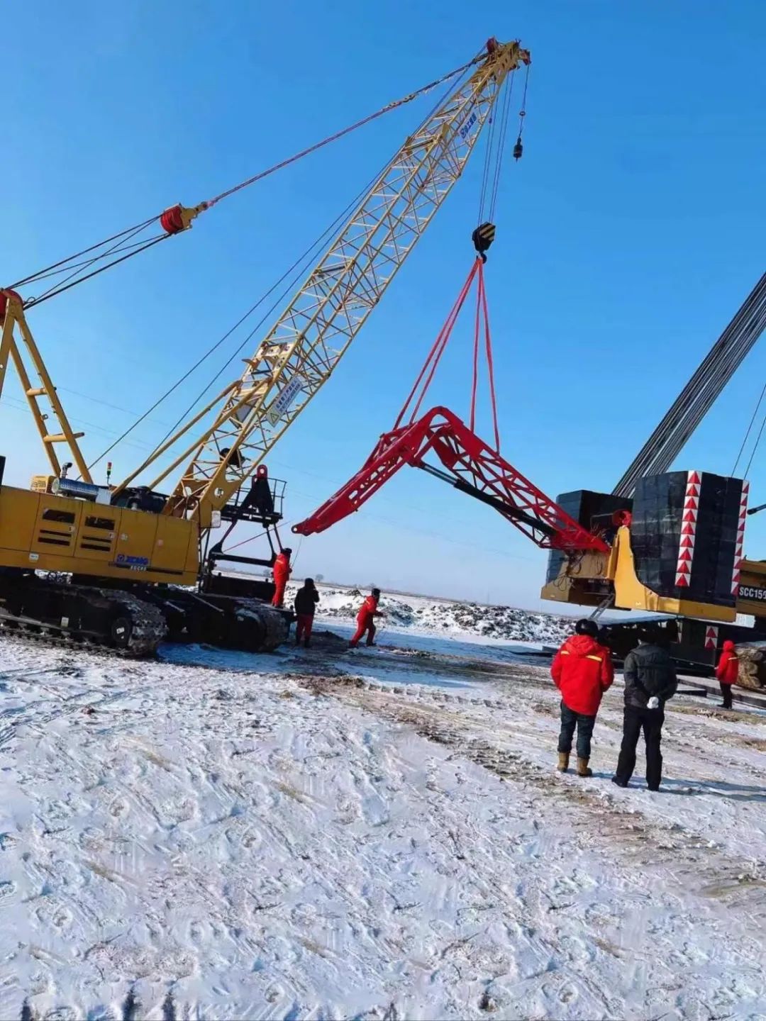 根据施工安排,当前正在紧锣密鼓地进行塔吊组装工作,加快风机吊装速度。为应对此次低温降雪天气,安全优质高效地完成施工任务,项目部提前谋划、主动出击,为作业人员配备防寒保暖劳保用品,并根据天气状况合理调整施工计划;组织员工开展施工安全教育,坚决落实施工安全措施,确保恶劣天气条件下安全防护不松懈、不打折扣,有效保障了施工现场各项工作的有序进行,为集团提质增效贡献力量。