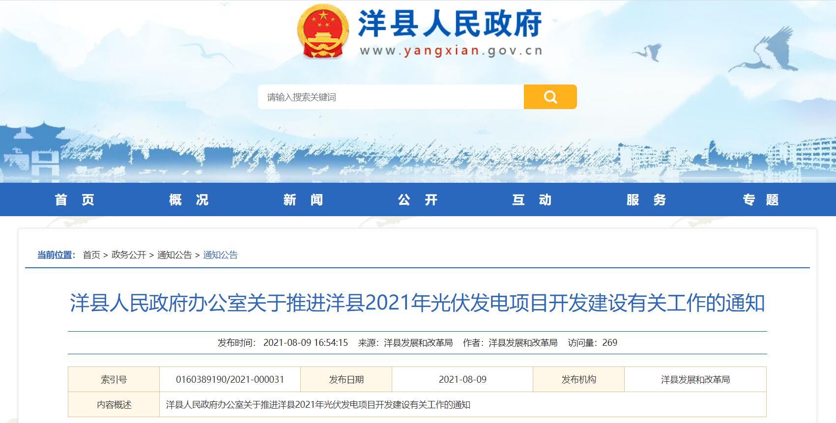 【政策通知】陕西洋县:2021年拟建集中式地面光伏200MW、分布式光伏180MW
