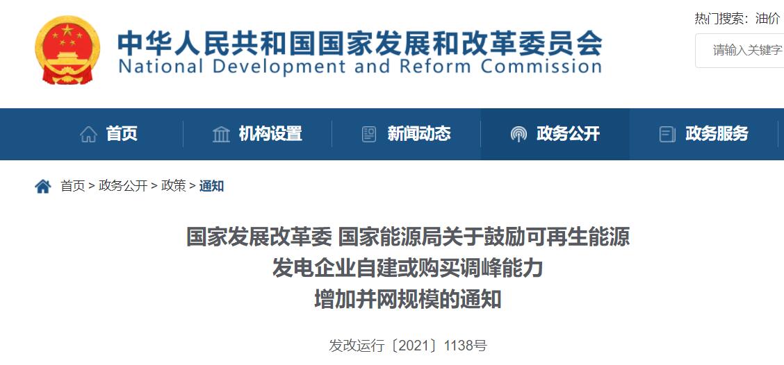 【政策通知】关于鼓励可再生能源发电企业自建或购买调峰能力增加并网规模的通知(发改运行〔2021〕1138号)