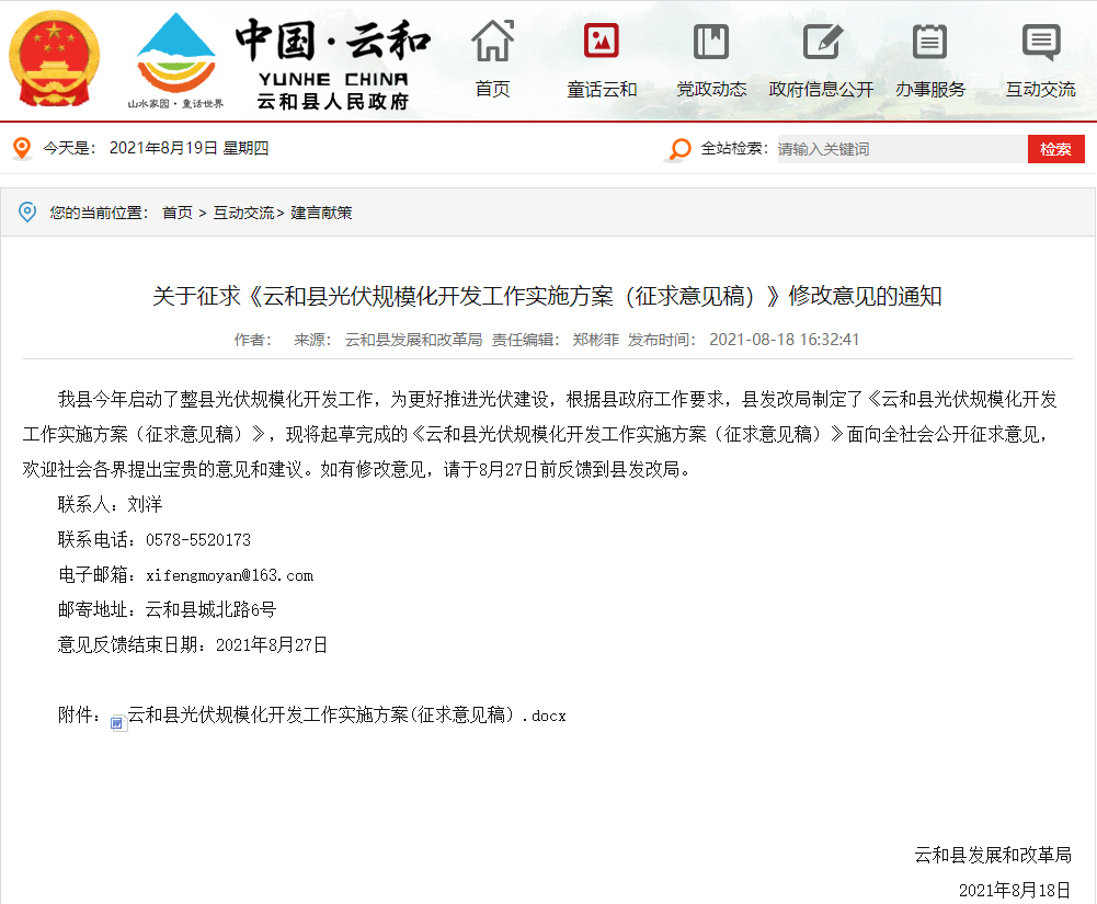 8月18日,云和县发展和改革局发布关于征求《云和县光伏规模化开发工作实施方案(征求意见稿)》修改意见的通知。