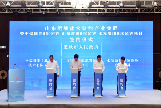 水发绿色能源股份有限公司代表与肥城市委常委、副市长张强在现场正式签约600MW盐穴压缩空气储能电站项目,并与中储国能(北京)技术有限公司签署技术装备合作协议。